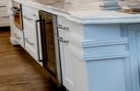 This white-on-white kitchen design has a grand-sized kitchen island with large columns and molding details. Get this look with Bertch’s Woodbridge Inset door style in the “White” painted finish.