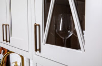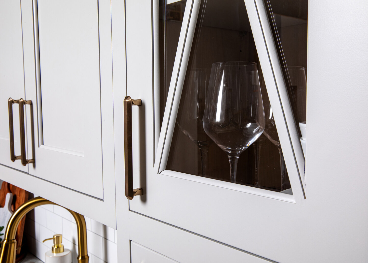 This Modern Farmhouse kitchen features a two-toned design with Bertch’s Winston door style in “Cloud” paint, accented by “Snowbank” stained Alder. The X Style End Cap makes a bold statement at the end of the kitchen peninsula.